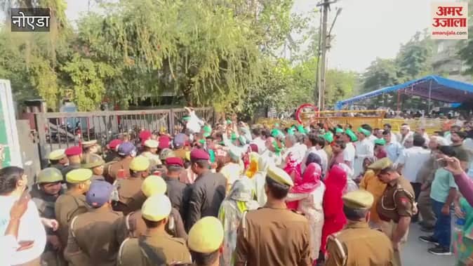 नोएडा सेक्टर-06 में प्राधिकरण के बाहर किसानों का प्रदर्शन