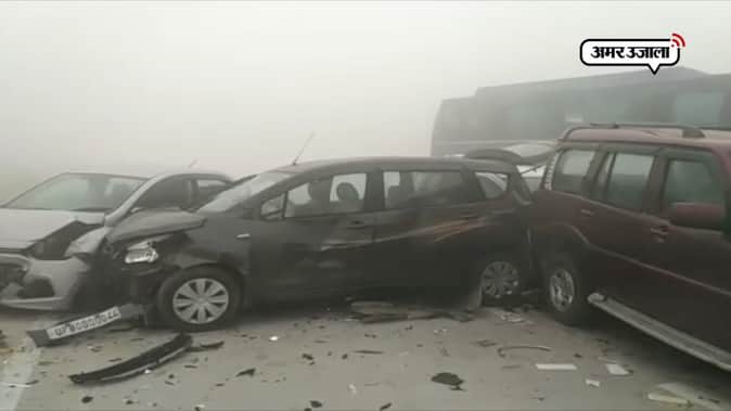 यमुना एक्सप्रेस वे पर दिखाई देना हुआ बंद, एक के बाद एक भिड़ीं दर्जनों गाड़ियां
