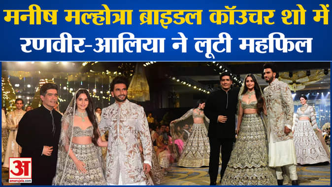 आगामी रोमांटिक फिल्म 'रॉकी और रानी की प्रेम कहानी' में सह-कलाकार रणवीर सिंह और आलिया भट्ट मुंबई में एक भव्य ब्राइडल कॉउचर शो 2023 में डिजाइनर मनीष मल्होत्रा के लिए शोस्टॉपर बने।