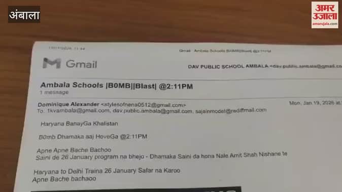 अंबाला के चार प्रतिष्ठित स्कूलों को ईमेल के जरिए बम से उड़ाने की धमकी मिलने के बाद हड़कंप मच गया है। यह मेल सोमवार को सुबह 8 बजकर 22 मिनट पर आई है। धमकी भरी मेल मिलने के बाद स्कूल प्रशासन व अभिभावकों में दहशत का माहौल है। सूचना मिलते ही पुलिस विभाग अलर्ट मोड पर आ गया। आनन-फानन में स्कूलों में सर्च ऑपरेशन शुरू किया गया। अभी अंबाला सिटी के एसए जैन स्कूल व पुलिस डीएवी रिवरसाइड अंबाला कैंट, केंद्रीय विद्यालय नंबर 1 स्कूल का नाम सामने आया है। अन्य कुछ स्कूलों को भी यह मेल मिली है।