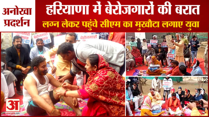 अनोखा प्रदर्शन:हरियाणा में बेरोजगारों की बरात, लग्न लेकर पहुंचे सीएम का मुखौटा लगाए युवा