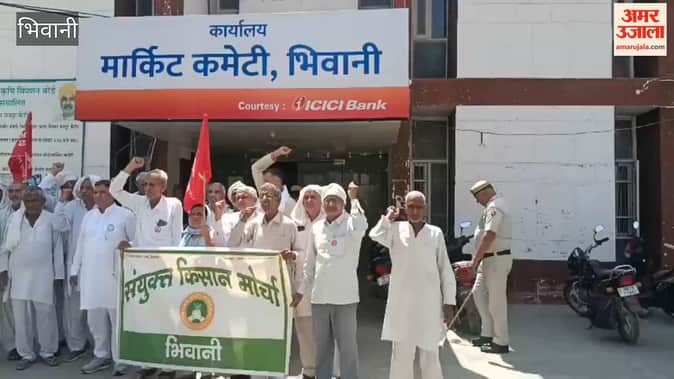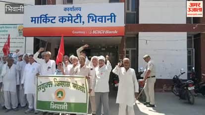 भिवानी: मार्केट कमेटी कार्यालय के बाहर अखिल भारतीय किसान यूनियन ने अपनी मांगों को लेकर किया प्रदर्शन