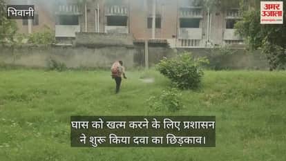 भिवानी: भीम स्टेडियम में उगी घास को खत्म करने के लिए प्रशासन ने शुरू किया दवा का छिड़काव