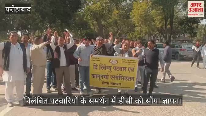 सरकार की ओर से प्रदेश में 6 पटवारियों को निलंबित किए जाने की कार्रवाई के विरोध में फतेहाबाद के पटवारी सोमवार को सड़कों पर उतरे। पटवारी पटवार भवन से चलकर लघु सचिवालय परिसर पहुंचे, इस दौरान उन्होंने नारेबाजी करते हुए मुख्यमंत्री के नाम डीसी डाॅ. विवेक भारती को ज्ञापन सौंपा।