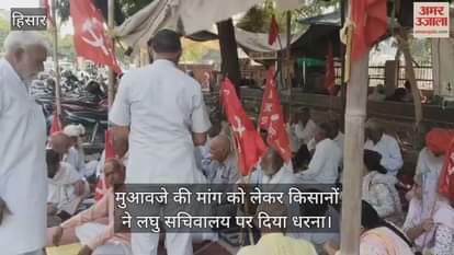 हिसार: खेतों से पानी निकासी, मुआवजे की मांग को लेकर किसानों ने लघु सचिवालय पर दिया धरना