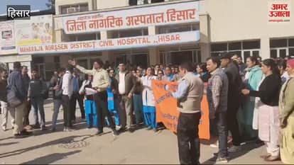 VIDEO : हिसार में एनएचएम कर्मियों ने जीईओ फेंसिंग अटेंडेंस सिस्टम का विरोध किया