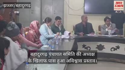 बहादुरगढ़ पंचायत समिति की अध्यक्ष वर्षा गौतम के विरुद्ध अविश्वास प्रस्ताव पास हो गया है। एडीसी जगनिवास की अध्यक्षता में हुई बैठक में चेयरपर्सन वर्षा गौतम के खिलाफ 20 सदस्यों ने वोट किया। ऐसे में अविश्वास प्रस्ताव पास हो गया। चेयरपर्सन वर्षा गौतम समेत 9 सदस्य बैठक से गैर हाजिर रहे। अविश्वास प्रस्ताव की बैठक में 20 पार्षद मौजूद थे। कुल 30 सदस्य हैं जबकि एक की मौत हो चुकी है। अविश्वास प्रस्ताव पास करने के लिए 20 सदस्य जरूरी थे।