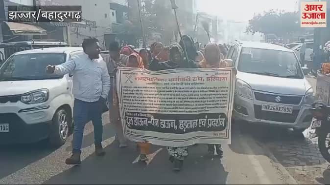 VIDEO : झज्जर में सफाई कर्मियों ने झाड़ू लेकर किया प्रदर्शन