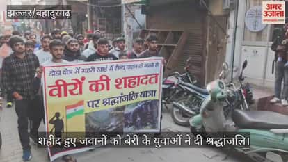 श्रद्धांजलि यात्रा बेरी नगर पालिका के वार्ड 13 के पार्षद हिमांशु उर्फ पिंटू के नेतृत्व में निकाली गई। श्रद्धांजलि यात्रा की शुरुआत बेरी गोशाला से शुरू होकर मेन बाजार, देवी मंदिर वाली गली, बस स्टैंड से होते शिव चौक पर समाप्त हुई। यात्रा में शामिल युवाओं ने भारत माता की जय और शहीदों अमर रहें जैसे नारों से वातावरण गूंज उठा, जिससे हर नागरिक की आंखें नम हो गई। बेरी नगर पालिका के पार्षद हिमांशु उर्फ पिंटू ने बताया कि युवाओं ने कहा कि शहीद जवानों का बलिदान कभी भुलाया नहीं जा सकता। वे देश की रक्षा करते हुए अपने प्राण न्योछावर कर गए और उनका यह सर्वोच्च त्याग आने वाली पीढ़ियों को प्रेरणा देता रहेगा। श्रद्धांजलि सभा के दौरान दो मिनट का मौन रखकर शहीदों की आत्मा की शांति के लिए प्रार्थना की गई। युवाओं ने एकजुट होकर यह संदेश दिया कि देश के वीर सपूतों का बलिदान व्यर्थ नहीं जाएगा और राष्ट्र सदैव उनका ऋणी रहेगा। श्रद्धांजलि यात्रा में दीपक, रवि कादयान, कालू, मिंटू मौजूद रहे।
