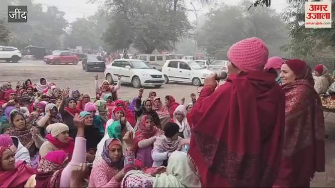 VIDEO : Anganwadi workers protest in Jind demanding implementation of Gujarat High Court's decision in Haryana