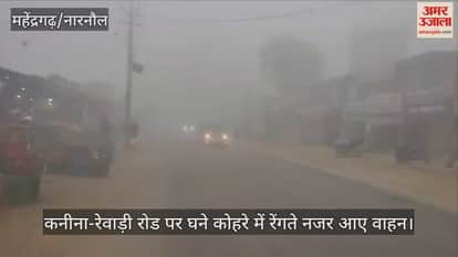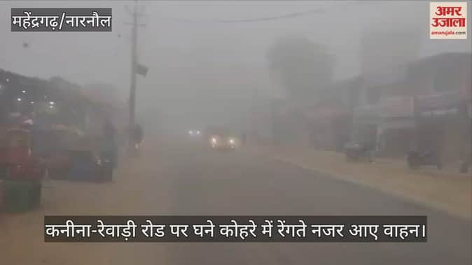 महेंद्रगढ़: कनीना-रेवाड़ी रोड पर घने कोहरे में रेंगते नजर आए वाहन, दृश्यता बेहद कम