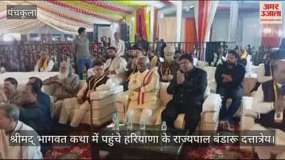पंचकूला के सेक्टर-5 स्थित शालीमार ग्राउंड में आयोजित श्रीमद् भागवत कथा में बुधवार को हरियाणा के राज्यपाल बंडारू दत्तात्रेय शामिल हुए। राज्यपाल ने प्रसिद्ध कथा वाचक दया किशोरी का पुष्प भेंट कर अभिवादन किया। इसके बाद श्रीमद् भागवत कथा का आनंद लिया। कथा वाचक जया किशोरी ने आपकी की कृपा से सब काम हो रहा है, करते हैं कन्हैया बस नाम हो रहा है भक्ति गीत गया, जिस पर श्रद्धालु झूम उठे। कथा के आयोजक माता मनसा देवी सेवा ट्रस्ट पंचकूला के पदाधिकारी ने राज्यपाल का कार्यक्रम में पहुंचने पर स्वागत किया और समृति चिन्ह देकर सम्मानित भी किया। इस मौके पर उनके साथ विधानसभा हरियाणा के पूर्व अध्यक्ष ज्ञानचंद गुप्ता, माता मनसा देवी सेवा ट्रस्ट पंचकूला के चेयरमैन संदीप गुप्ता, प्रधान सचिन, महासचिव रमन सिंगला, एसडीएम गौरव चौहान, नगराधीश विश्वनाथ, कवि सुरेंद्र सिंगला, अनिल कुमार, सुनील, राजकुमार गोयल सहित अन्य गणमान्य मौजूद रहे।