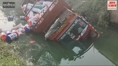 VIDEO : पानीपत में सड़क किनारे तालाब में पलटा कैंटर