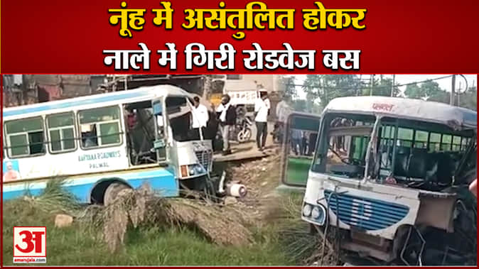 नूंह में असंतुलित होकर नाले में गिरी रोडवेज बस,एक घंटे की कड़ी मशक्कत के बाद बस को निकाला गया