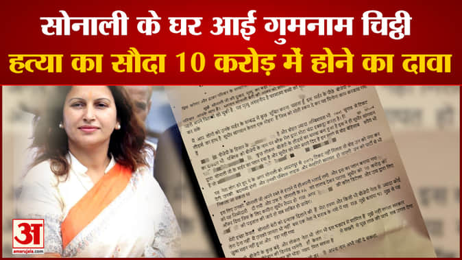 बीजेपी नेता सोनाली फोगाट के नाम उनके संत नगर स्थित घर पर एक गुमनाम चिट्ठी भेजी गई है, जिसमें सोनाली के मर्डर का सौदा 10 करोड़ में होने का दावा किया गया है। मर्डर में एक पार्टी के नेता पर आरोप लगाया गया है।