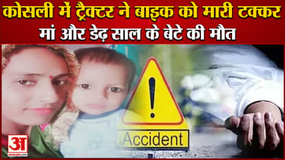 रेवाड़ी के कस्बा कोसली में एक तेज रफ्तार ट्रैक्टर ने बाइक को टक्कर मार दी। हादसे में डेढ़ साल के बच्चे और उसकी मां की मौत हो गई, जबकि उसके पिता गंभीर रूप से घायल हो गया।