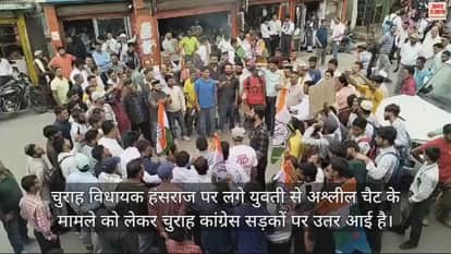 चुराह विधायक हंसराज पर लगे युवती से अश्लील चैट के मामले को लेकर चुराह कांग्रेस सड़कों पर उतर आई है। बुधवार को चुराह कांग्रेस के ब्लॉक अध्यक्ष अश्वनी ठाकुर, कांग्रेसी नेता यशबंत खन्ना, प्रदेश कांग्रेस सचिव दिलदार अली बटट की अगुवाई में कांग्रेस नेताओं, पदाधिकारियों और सदस्यों ने भंजराडू बाजार में चुराह विधायक का पूतला फूंक कर मूर्दाबाद तक के नारे लगाए। कांग्रेसियों ने भंजराडू स्टैंड से लेकर उपमंडलाधिकारी कार्यालय चुराह तक रोष रैली निकाली। कांग्रेसी पदाधिकारियों ने विधायक के खिलाफ निष्पक्ष जांच की मांग करते हुए उपमंडलाधिकारी चुराह के माध्यम से राज्यपाल को ज्ञापन भेज कर निष्पक्ष जांच और विधानसभा अध्यक्ष से चुराह विधायक की विधानसभा से सदस्यता रद्द करने की मांग उठाई है।