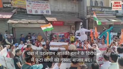 चंबा में पहलगाम आतंकी हमले के विरोध में गुरुवार को लोगों का गुस्सा फूटा। हिंदू संगठन ने हमले के विरोध में प्रदर्शन किया और शहर में रैली निकाली। चंबा में सभी व्यापारियों ने अपनी दुकानें बंद रखी हैं । पूरा चंबा शहर पाकिस्तान मुर्दाबाद के नारों से गूंज उठा।