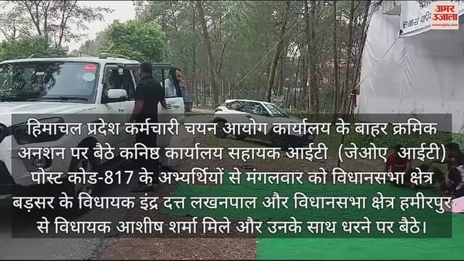हिमाचल प्रदेश कर्मचारी चयन आयोग कार्यालय के बाहर क्रमिक अनशन पर बैठे कनिष्ठ कार्यालय सहायक आईटी (जेओए आईटी) पोस्ट कोड-817 के अभ्यर्थियों से मंगलवार को विधानसभा क्षेत्र बड़सर के विधायक इंद्र दत्त लखनपाल और विधानसभा क्षेत्र हमीरपुर से विधायक आशीष शर्मा मिले और उनके साथ धरने पर बैठे। इस दौरान दोनों विधायकों ने अभ्यर्थियों को उनकी तरफ से हर संभव मदद का आश्वासन दिया और कहा कि भारतीय जनता पार्टी इस मुद्दे को जोर-जोर से सरकार के समक्ष रखेगी। बीते 5 वर्षों से इन अभ्यर्थियों का भविष्य अधर में लटका हुआ है। सुप्रीम कोर्ट के आदेशों के बावजूद भी सरकार इस पोस्ट का अंतिम परिणाम घोषित नहीं कर रही है। जो बेहद शर्मनाक है। विधायक लखनपाल ने कहा कि इस मुद्दे को वह कॉंग्रेस विधायक होते हुए भी कई बार सरकार के समक्ष रख चुके हैं लेकिन सरकार ने इस विषय को गंभीरता से नहीं लिया। इस मुद्दे के प्रति सरकार नकारात्मक रवैया अपनाए हुए है। वहीं विधायक आशीष शर्मा ने कहा कि अगर सरकार जल्द से जल्द इस पोस्ट कोड का परिणाम घोषित नहीं करती है तो भारतीय जनता पार्टी इस मुद्दे को लेकर कड़े कदम उठाएगी और सरकार का पुरजोर विरोध करेगी। उन्होंने कहा कि पहले भी इन अभ्यर्थियों के साथ कंधे से कंधा मिलाकर खड़े थे और आगे भी खड़े रहेंगे। सरकार ने न तो एक लाख नौकरियों का वायदा पूरा किया और न ही जो परीक्षाएँ युवाओं ने उतीर्ण की है उनके परिणाम निकाले। जिस कारण युवाओं का भविष्य दांव पर लगा हुआ है। दोनों विधायकों नेमुख्यमंत्री से अपील की है कि इस लंबित परिणाम को जल्द से जल्द घोषित कर युवाओं को राहत प्रदान की जाए।
