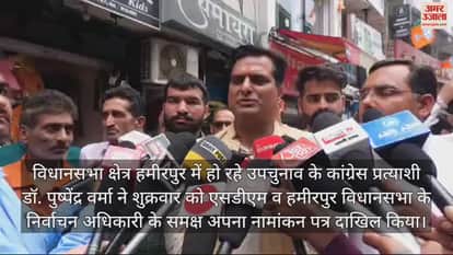विधानसभा क्षेत्र हमीरपुर में हो रहे उपचुनाव के कांग्रेस प्रत्याशी डॉ. पुष्पेंद्र वर्मा ने शुक्रवार को एसडीएम व हमीरपुर विधानसभा के निर्वाचन अधिकारी के समक्ष अपना नामांकन पत्र दाखिल किया। इस मौके पर डॉ. पुष्पेंद्र के साथ, सुजानपुर के विधायक कैप्टन रंजीत राणा, डॉ. वर्मा की धर्मपत्नी व उनके पिता व पूर्व मंत्री रणजीत वर्मा मौजूद रहे। इससे पूर्व गांधी चौक में एक विशाल रैली का आयोजन किया गया जिसमें मुख्यमंत्री ठाकुर सुखविंद्र सिंह सुक्खू, डिप्टी सीएम मुकेश अग्निहोत्री व कांग्रेस की प्रदेशाध्यक्ष प्रतिभा सिंह समेत पार्टी के पदाधिकारी व कार्यकर्ता मौजूद रहे।