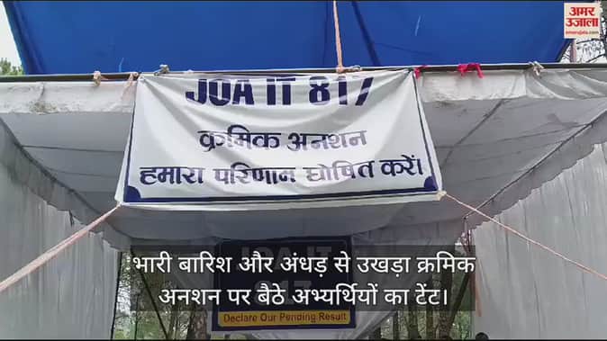VIDEO : भारी बारिश के बीच क्रमिक अनशन पर डटे अभ्यर्थी, टेंट उखड़ा