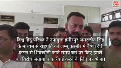 विश्व हिंदू परिषद ने उपायुक्त हमीरपुर अमरजीत सिंह के माध्यम से राष्ट्रपति को जम्मू कश्मीर में वैष्णो देवी कटरा से शिवखोड़ी जाते समय बस पर किए हमले का विरोध जताया व कार्रवाई करने के लिए पत्र भेजा। जम्मू कश्मीर में वैष्णों देवी कटरा से शिवखोड़ी जाते समय नौ जून को हिंदू श्रद्धालुओं की बस पर पाकिस्तान पोषित इस्लामिक जेहादी आतंकवादियों ने हमला किया। जिसमें 10 निर्दोष हिंदू तीर्थयात्री मारे गए। यह संपूर्ण देशवासियों को स्तब्ध करने वाली घटना है। जम्मू काश्मीर लंबे समय से पाकिस्तान पोषित आतंकवाद का दंश झेल रहा है। जिला संयोजक आशीष शर्मा ने कहा कि धारा 370 हटने के बाद एक आशा की ज्योति जगी है, लेकिन लगता है उग्रवादियों का मनोबल अभी कम नहीं हुआ है। हिंदुओं को चिन्हित करके उनकी हत्या की घटनाएं बढ़ी हैं। इन सब के पीछे स्पष्ट रूप से पाकिस्तान का हाथ है। बजरंग दल इस कायराना कृत्य की तीव्र निंदा की और निवेदन किया कि इस प्रकार की गतिविधियों पर पूर्ण नियंत्रण पाने के लिए निर्णायक और कठोर कदम उठाने का केंद्र सरकार को निर्देश दें तथा इस प्रकार के तत्वों को सरंक्षण देने वाले आंतरिक व विदेशी तत्वों का भी कठोरता से समुचित इलाज हो।