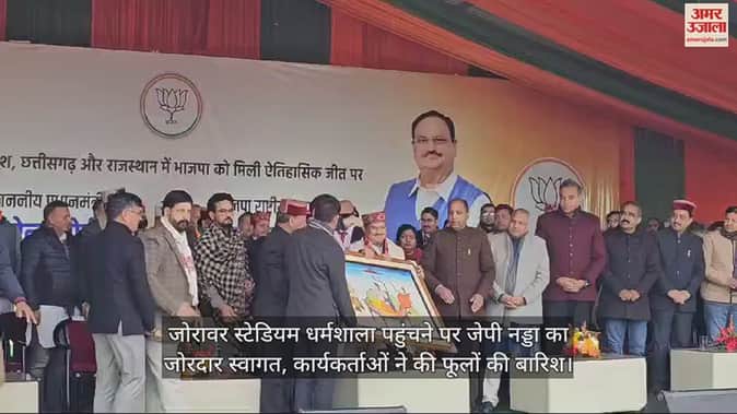 VIDEO : जोरावर स्टेडियम धर्मशाला पहुंचने पर जेपी नड्डा का जोरदार स्वागत, कार्यकर्ताओं ने की फूलों की बारिश