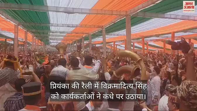 VIDEO : In Priyanka Gandhi's rally, workers carried Vikramaditya Singh on their shoulders and took him to the stage