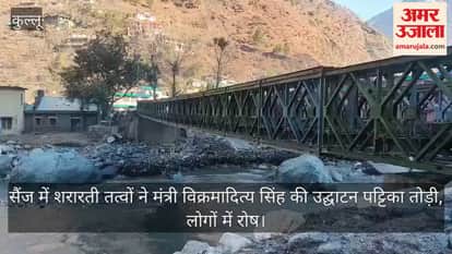 हिमाचल प्रदेश के कुल्लू जिले के सैंज में शरारती तत्वों ने लोक निर्माण मंत्री विक्रमादित्य सिंह की उद्घाटन पट्टिका को तोड़ दिया है। 9 दिसंबर 2023 को लोक निर्माण मंत्री ने सैंज में पुल का उद्घाटन किया था। मंत्री की उद्घाटन पट्टिका तोड़ने के बाद स्थानीय लोगों में भारी रोष है। लोगों ने पुलिस से कड़ी कार्रवाई की मांग की है।