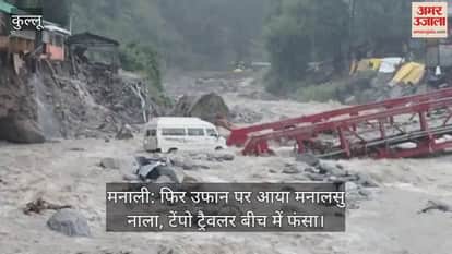 ओल्ड मनाली का मनालसु नाला फिर उफान पर आ गया है। लगातार हो रही बारिश के कारण जलस्तर बढ़ गया है। नाले का पानी 26 अगस्त को ढह चुके पुल के एक छोर से बह रहा है। वहीं ओल्ड मनाली की ओर जा रहा एक टेंपो ट्रैवलर भी पानी के उफान में फंस गया है। प्रशासन ने वाहनों की आवाजाही पर रोक लगा दी है।