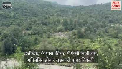Kullu: छन्नीखोड़ के पास कीचड़ में फंसी निजी बस, अनियंत्रित होकर सड़क से बाहर निकली