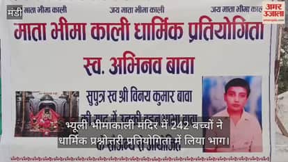 मंडी शहर के भ्यूली में स्थित भीमाकाली मंदिर परिसर में रविवार को धार्मिक प्रश्नोत्तरी प्रतियोगिता का आयोजन किया गया। इस प्रतियोगिता में 250 के करीब स्कूली बच्चों ने भाग लिया। बता दें, मंडी निवासी विनय कुमार बावा और प्रोफेसर सीमा बावा के स्वर्गीय बेटे अभिनव बावा की स्मृति में परिजन हर साल जनवरी में इस प्रतियोगिता को करवाते आए हैं। इस मौके पर परिजनों की ओर से सभी के लिए प्रीति भोज का भी आयोजन किया गया था। धार्मिक प्रतियोगिता की आयोजक व स्वर्गीय अभिनव बावा की बहन आभा बावा ने बताया कि इस प्रतियोगिता में विभिन्न स्कूलों के 242 छात्रों ने भाग लिया। प्रतियोगिता को कनिष्ठ और वरिष्ठ दो वर्गों में करवाया गया, जिसका परिणाम अप्रैल माह में भ्यूली में होने वाले वैखाशी मेले में निकाला जाएगा। उन्होंने बताया कि इस प्रतियोगिता में भाग लेने वाले प्रतिभागियों को उनकी ओर से एक-एक कार्डबोर्ड भी उपहार स्वरूप दिया गया।