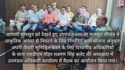 आगामी मानसून को देखते हुए उपमंडल स्तर पर मानसून सीजन में प्राकृतिक आपदा से निपटने के लिए निर्धारित कार्य योजना अनुसार अपनी तैयारी सुनिश्चित करने के लिए विभागीय अधिकारियों के साथ एसडीएम गोहर लक्ष्मण सिंह कनेट की अध्यक्षता में उपमंडल अधिकारी कार्यालय में बैठक का आयोजन किया गया। बैठक की अध्यक्षता करते हुए एसडीएम गोहर ने सभी विभागीय अधिकारियों को निर्देश देते हुए कहा कि मानसून के दौरान किसी भी प्राकृतिक आपदा से निपटने के लिए सभी विभाग अपने-अपने स्तर पर बैकअप प्लान ,मशीनरी व्यवस्था, मानव संसाधन, की प्लानिंग का ब्यौरा बनाकर अधोहस्ताक्षरी कार्यालय में प्रस्तुत करें तथा प्राकृतिक आपदा से निपटने के लिए सभी विभाग अपने-अपने स्तर पर एक नोडल ऑफिसर भी नियुक्त करें, ताकि आपदा के समय रिस्पांस टीम कोई बाधा उत्पन्न ना हो तथा एसडीम कार्यालय के द्वारा बनाए गए सब डिविजनल आपदा प्रबंधन व्हाट्सएप ग्रुप में अपने-अपने फील्ड के सभी अधिकारी व कर्मचारियों को जोड़ें ताकि आपदा के समय में किसी भी प्रकार की सूचना को ग्रुप में शेयर करें ताकि राहत कार्य को कम से कम समय में शुरू किया जा सके। लोक निर्माण विभाग के अधिकारियों मानसून के दौरान अवरुद्ध सड़कों को खोलने व वाहनों की आवाजाही के लिए चिन्हित मार्गो चैलचौक से पंण्डोह मार्ग, चैलचौक से देवीदढ़ मार्ग, चैलचौक से रोहण्डा मार्ग ,चैलचौक से थुनाग मार्ग पर जेसीबी तैनात करें। तथा चिन्हित पुलों व सड़कों की मरम्मत व जल निकासी का निर्माण करें ताकि लोगों को किसी भी प्रकार की परेशानी का सामना न करना पड़े तथा जल शक्ति अधिकारियों को निर्देश देते हुए बरसात के दौरान पानी के सोर्स पर साफ सफाई सुनिश्चित करें ताकि लोगों को स्वच्छ पानी उपलब्ध हों और इलेक्ट्रिसिटी विभाग को निर्देश देते हुए उन्होंने कहा कि उप मंडल स्तर के सभी सबस्टेशन पर बैकअप बिजली के पोल, बिजली के तार की व्यवस्था सुनिश्चित करें ताकि बरसात के दौरान होने बिजली की सप्लाई में होने वाले कट को कम से कम समय में सुधारा जा सके और लोगों को बिजली उपलब्ध करवाई जाए तथा स्वास्थ्य विभाग को निर्देश देते हुए उन्होंने कहा की बरसात के दौरान उभरते वाली प्रमुख बीमारियों के दवाइयां की व्यवस्था तथा एक एंबुलेंस की व्यवस्था उपलब्ध हों खाद्य आपूर्ति विभाग को मानसून को देखते हुए खाद्यान्न गोदाम में दो से तीन महीने का खाद्यान्न स्टॉक जमा करने के निर्देश दिए गए तथा शिक्षा विभाग के अधिकारियों को आपदा के दौरान आश्रय स्थलों की जरूरत पड़ने पर सरदार पटेल यूनिवर्सिटी की शाखा महाविद्यालय बासा की बिल्डिंग तथा महाविद्यालय बासा के गर्ल्स हॉस्टल को चिन्हित किया गया है तथा इसमें सभी व्यवस्थाएं उपलब्ध हों तथा बरसात के दौरान तथ