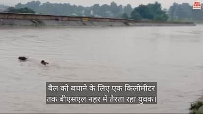 VIDEO : बैल को बचाने के लिए एक किलोमीटर तक बीएसएल नहर में तैरता रहा युवक