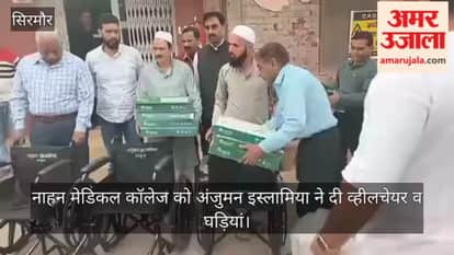 रमजान के पवित्र महीने में अंजुमन इस्लामिया नाहन ने मेडिकल कॉलेज नाहन को 11 दीवार घड़ी और चार व्हीलचेयर भेंट कीं। संगठन के प्रधान बॉबी मोहम्मद और उपाध्यक्ष कैप्टन सलीम अहमद ने ये सामग्री कॉलेज प्रबंधन को सौंपी।