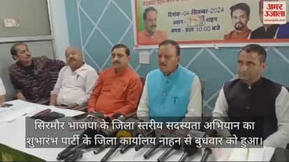 सिरमौर भाजपा के जिला स्तरीय सदस्यता अभियान का शुभारंभ पार्टी के जिला कार्यालय नाहन से बुधवार को हुआ। जिला स्तरीय इस अभियान का आगाज जिला अध्यक्ष विनय गुप्ता ने सांसद सुरेश कश्यप और जिला परिषद की अध्यक्ष सीमा कन्याल को पार्टी का सदस्य बनाकर किया। इसके बाद नगर परिषद नाहन की अध्यक्षा श्यामा पुंडीर समेत दूसरे लोगों को पार्टी का सदस्य बनाया। इस मौके पर सांसद सुरेश कश्यप विशेष रूप से मौजूद रहे। पत्रकारों से वार्ता करते हुए जिला अध्यक्ष विनय गुप्ता ने कहा कि बुधवार से सिरमौर में पार्टी का सदस्यता अभियान शुरू कर दिया गया है। पहले चरण का सदस्यता अभियान 25 सितंबर तक चलेगा। उन्होंने कहा कि सिरमौर जिला में भारतीय जनता पार्टी ने 1 लाख 25 हजार लोगों को पार्टी का सदस्य बनाने का लक्ष्य निर्धारित किया है। विनय गुप्ता ने कहा कि सिरमौर जिला में 589 पोलिंग बूथ है और हर पोलिंग बूथ पर 200 नए सदस्य बनाने का लक्ष्य भारतीय जनता पार्टी द्वारा रखा गया है।