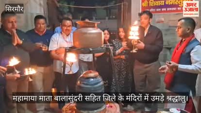 चैत्र नवरात्र के पहले दिन जिला सिरमौर के मंदिरों में आस्था का सैलाब उमड़ा। दर्शनों के लिए श्रद्धालु सुबह से ही मंदिरों में पहुंचे। दिनभर मंदिरों में श्रद्धालुओं की कत्तारें लगी रही। प्रसिद्ध मंदिरों में स्थानीय लोगों सहित सीमावर्ती हरियाणा व आसपास के राज्यों से दर्शनों के लिए भारी संख्या में श्रद्धालु पहुंचे। जिला के प्रसिद्ध महामाया माता बालासुंदरी मंदिर त्रिलोकपुर में उपायुक्त सिरमौर एवं आयुक्त मंदिर न्यास माता बाला सुंदरी, प्रियंका वर्मा ने गुरुवार को परिवार सहित विधिवत रूप से पूजा-अर्चना व हवन यज्ञ कर मेले का शुभारंभ किया। इस दौरान उन्होंने जिला वासियों को नवरात्र पर्व की शुभकामनाएं दीं। श्रद्धालुओं की सुविधा के लिए प्रबंधन ने श्री महामाया बालासुन्दरी मंदिर त्रिलोकपुर के कपाट भक्तों के दर्शन करने के लिए सुबह 3:30 बजे ही खोल दिए। वहीं, जिला मुख्यालय नाहन में ऐतिहासिक कालीस्थान मंदिर में सुबह भी विधिवत पूजा अर्चना हुई। दिनभर यहां श्रद्धालुओं का तांता लगा रहा। उपायुक्त ने बताया कि माता बालासुंदरी मेला त्रिलोकपुर में हिमाचल से ही नहीं, बल्कि हरियाणा सहित अन्य राज्य से भी बहुत अधिक संख्या में श्रद्धालु माता के दर्शनों के लिए आते हैं। शाम के समय मां बाला सुंदरी मंदिर त्रिलोकपुर के शिव तलाब में भव्य आरती का आयोजन किया गया। आरती के दौरान सहायक आयुक्त विवेक शर्मा, एसडीएम नाहन एवं संयुक्त आयुक्त मंदिर न्यास राजीव सांख्यान ने आरती में भाग लिया।