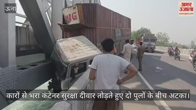 नंगल: कारों से भरा कंटेनर सुरक्षा दीवार तोड़ते हुए दो पुलों के बीच अटका