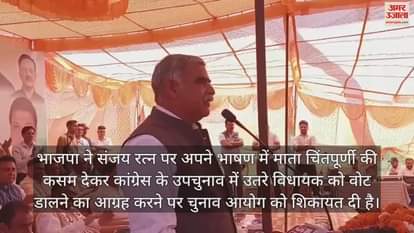 भाजपा ने ज्वालामुखी विधानसभा के कांग्रेस पार्टी के विधायक संजय रत्न के खिलाफ चुनाव आयोग में लिखित शिकायत कर कार्रवाई की मांग की है। भाजपा ने शिकायत पत्र में संजय रत्न पर अपने भाषण में माता चिंतपूर्णी की कसम देकर कांग्रेस के उपचुनाव में उतरे विधायक को वोट डालने का आग्रह किया जो कि चुनाव आचार सहिंता का उल्लंघन है।
