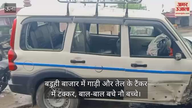 Una: बड़ूही बाजार में गाड़ी और तेल के टैंकर में टक्कर, बाल-बाल बचे नाै बच्चे