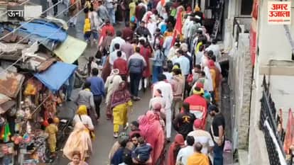 Una Amidst the rain, a flood of devotees surged into the shrine of Maa Chintpurni, with long queues of pilgrims stretching all the way to the main market