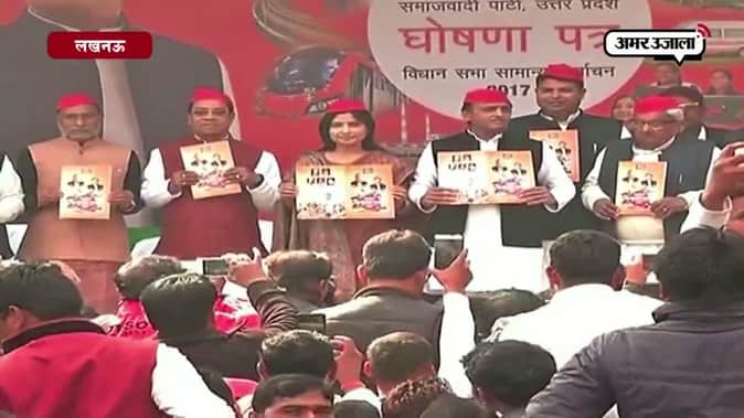 उत्तर प्रदेश में विधानसभा चुनाव के लिए मुख्यमंत्री अखिलेश यादव ने समाजवादी पार्टी का घोषणा पत्र जारी कर दिया। पार्टी के अध्यक्ष अखिलेश यादव, सांसद डिंपल यादव के अलावा पार्टी के अन्य नेताओं ने मेनिफेस्टो रिलीज किया। अखिलेश यादव ने इस घोषणापत्र में प्रदेश की जनता से कई लोकलुभावन वादे किए हैं। घोषणा पत्र में स्मार्ट फोन से लेकर महिलाओं के लिए प्रेशर कुकर देने का वादा शामिल है। इसके अलावा गरीब लोगों को मुफ्त गेंहूं-चावल और एक करोड़ लोगों को 1000 रुपये की मासिक पेंशन देने की बात भी कही गई है। वहीं चुनावी घोषणा पत्र जारी किए जाने के दौरान मुलायम सिंह यादव और शिवपाल यादव मौजूद नहीं थे।