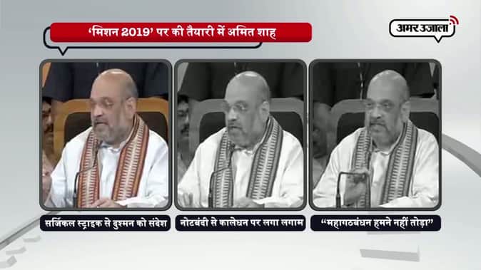 ‘मिशन 2019’ की तैयारी में जुटे बीजेपी अध्यक्ष अमित शाह सोमवार को लखनऊ पहुंचे। यहां सीएम योगी और डिप्टी सीएम केशव प्रसाद मौर्य की मौजूदगी में हुई प्रेस वार्ता में अमित शाह ने सरकार की उपलब्धियां गिनवाई। अमित शाह ने सर्जिकल स्ट्राइक और नोटबंदी जैसी उप्लब्धियों का बखान किया। साथ ही बिहार में महागठबंधन तोड़ने के आरोप पर भी शाह ने जवाब दिया।