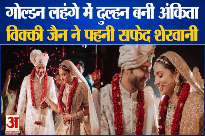 गोल्डन लहंगे में दुल्हन बनीं अंकिता लोखंडे, विक्की जैन ने पहनी सफेद शेरवानी, देखिए शादी की तस्वीरें