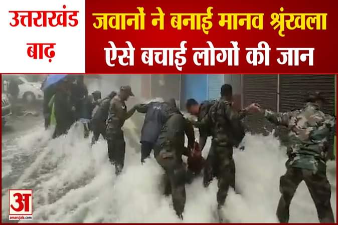 नैनीताल में सेना के जवान मानव श्रृंखला बनाकर एक दुकान में फंसे कई लोगों को बाहर सुरक्षित निकाला। जवानों को बचाने के लिए उनके पीछे भी कुछ लोग खड़े दिखाई दिए।