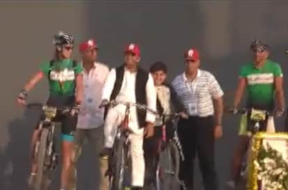 जब साइकिल से मंच तक पहुंचे सीएम अखिलेश, आगरा में उमड़ा हुजूम