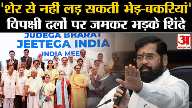 महाराष्ट्र के मुख्यमंत्री एकनाथ शिंदे ने सोमवार को जमकर विपक्षी दलों पर निशाना साधा। यहां तक की उन्होंने पीएम को शेर तक बता दिया। उन्होंने कहा कि विपक्षी दल केवल प्रधानमंत्री नरेंद्र मोदी को हराने के बारे में सोचते हैं, लेकिन भेड़-बकरियां जंगल में शेर के खिलाफ लड़ाई नहीं लड़ सकतीं।