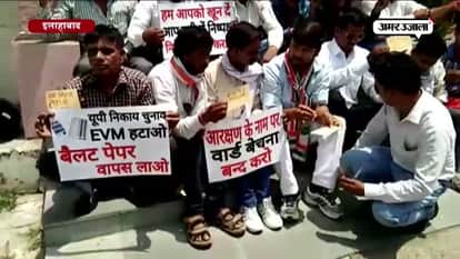 इलाहाबाद में निकाय चुनाव में वार्डों के आरक्षण में धांधली का आरोप लगाते हुए कांग्रेस और एसपी कार्यकर्ताओं ने कमिश्नर कार्यालय पर सीएम योगी को अपने खून से खत लिखा और निष्पक्ष निकाय चुनाव कराने के लिए EVM की जगह बैलेट पेपर से निकाय चुनाव कराए जाने की मांग की।
