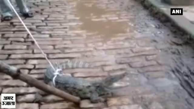 गांव में मगरमच्छ के घुसने पर मचा हड़कंप, मुश्किल से किया गया काबू