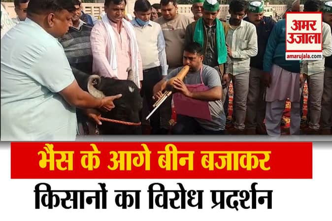 नए कृषि कानूनों के खिलाफ किसानों ने दिल्ली कूच करने के लिए जमकर बगावती तेवर दिखाए। अलग-अलग संगठन से जुड़े किसानों ने दिनभर सिस्टम को छकाए रखा। वहीं, नोए़डा के दलित प्रेरणा स्थल पर किसानों ने प्रदर्शन के दौरान भैंस के आगे बीन बजाकर केंद्र सरकार पर निशाना साधा। जिसके बाद इस घटना का वीडियो सोशल मीडिया पर जमकर वायरल हो रहा है।